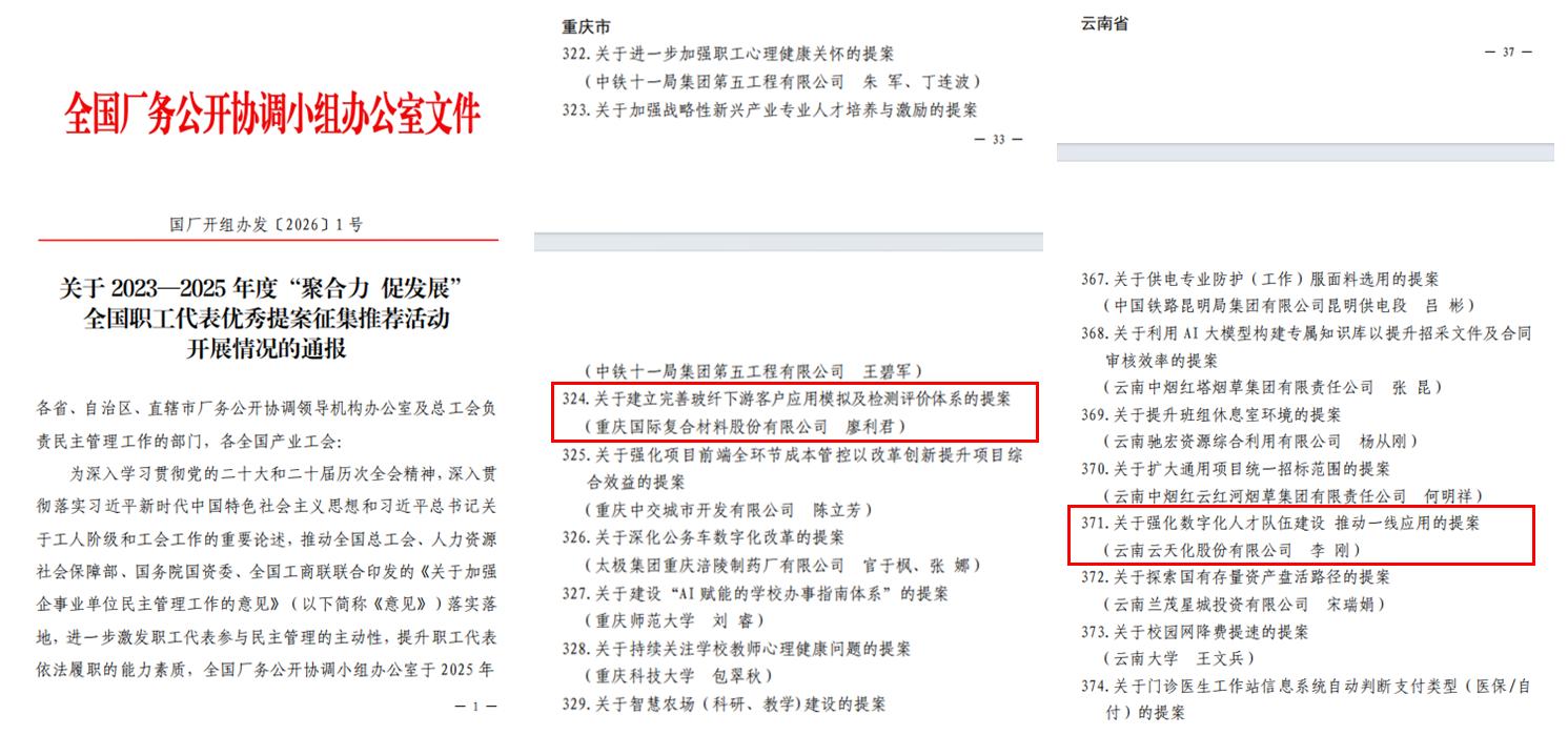 精心组织、严格筛选,择优推荐聚焦企业发展、技术革新、经营管理等维度的高质量提案。此次职工代表提案的成功获评,不仅是对云天化职工民主管理工作成效的高度认可,更体现了集团在深化产业工人队伍建设、推动新质生产力发展方面的务实举措。